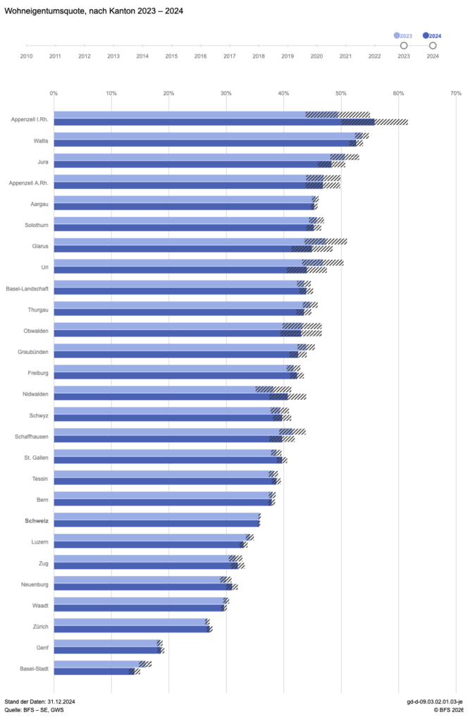 Im Kanton Appenzell-Innerrhoden lag die Wohneigentumsquote in der Schweiz am höchsten und kam 2024 auf rund 55 Prozent.