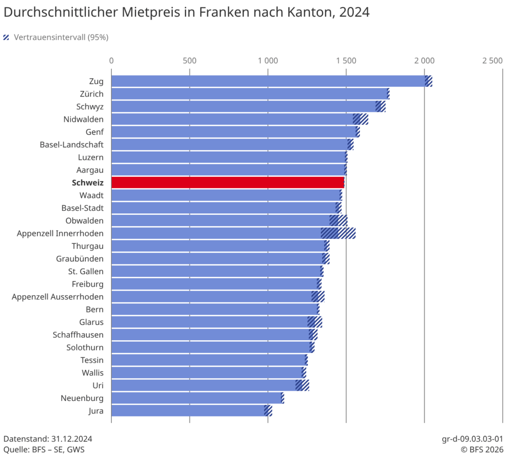 Die durchschnittlichen Mietpreise variieren von Kanton zu Kanton ebenfalls stark.