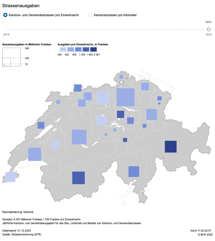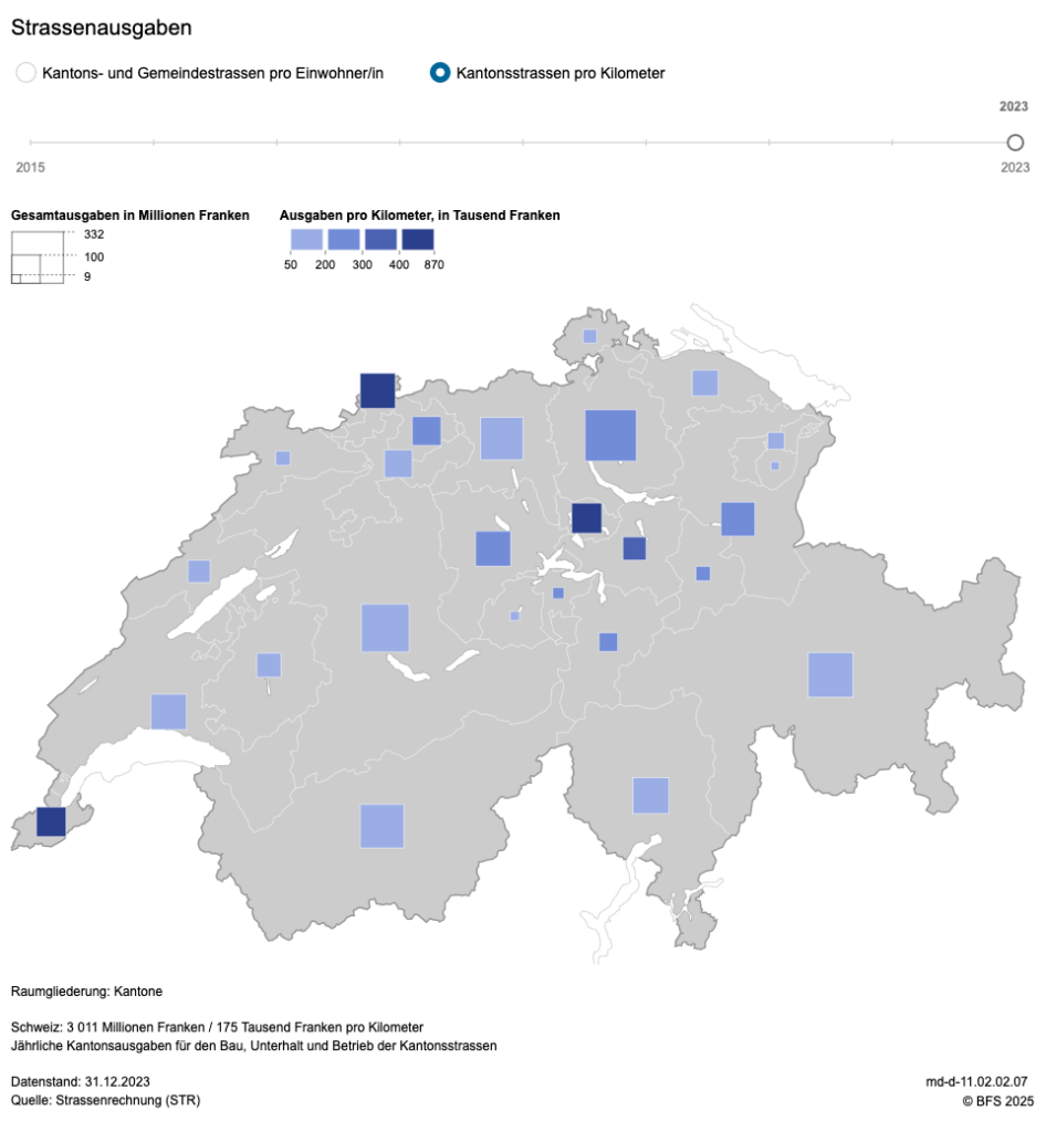 Die Schweiz gab 2023 gesamthaft rund 3 Milliarden Franken an Kantonsausgaben für den Bau, den Unterhalt und den Betrieb der Kantonsstrassen aus. Dies waren 175.000 Franken je Kilometer.